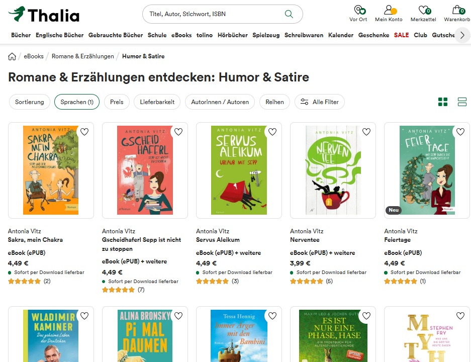 Wer im August ’25 auf Thalia die beliebtesten Humorbücher gesucht hat, kam um Antonia Vitz nicht herum: Die bei den Lesern fünf beliebtesten Bücher stammen alle aus ihrer Feder.